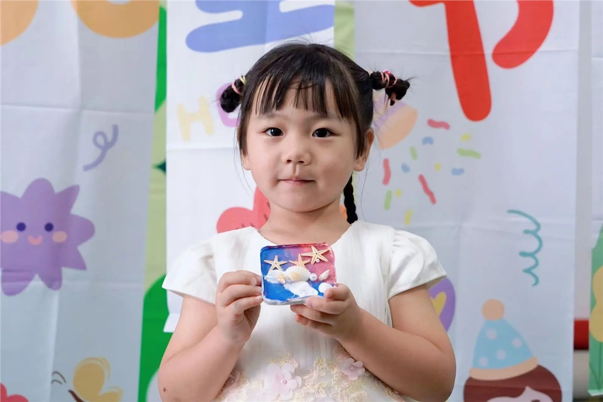 ▲在父母的陪伴與引導下,萌娃們用巧手將色彩斑斕的材料變?yōu)橐幻睹丢氁粺o二的創(chuàng)意冰箱貼。