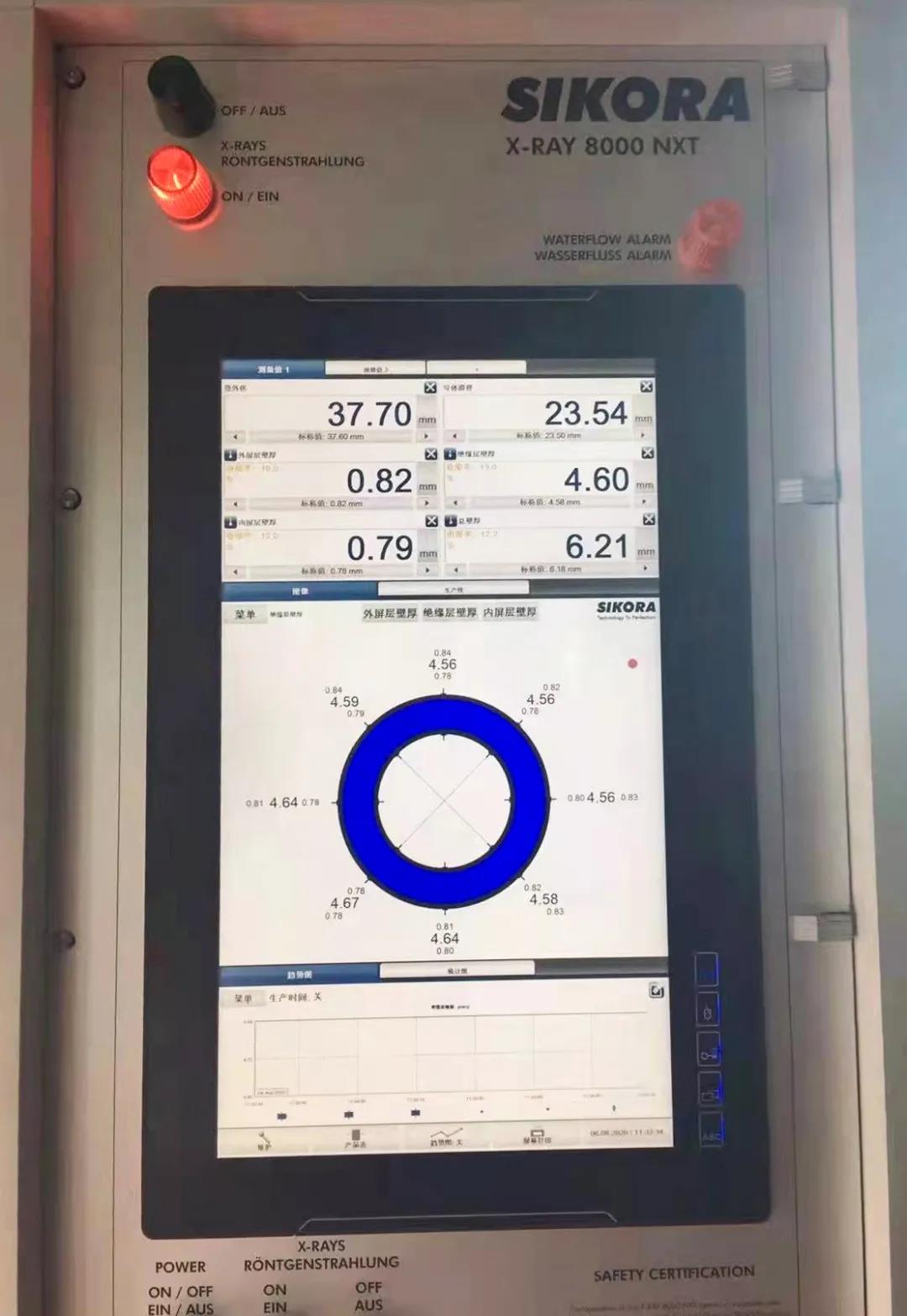 “嚴把質量關,產(chǎn)品質量有保證?!惫具€大力引進德國進口西科拉交聯(lián)管內電纜偏心壁厚分層辨析系統(tǒng),在每一個掃描器上配備新一代的雙接收器的測偏儀,保證儀器在任何激烈電纜抖動情況下也能進行精確可靠的檢測,并采用全新的門控技術控制X射線的發(fā)射,X射線的轉換效率更高,操作溫度更低,從而保護射線管,生產(chǎn)過程實時監(jiān)控中壓電纜內屏,絕緣,外屏三層擠出時采集八點厚度,精準實時監(jiān)控絕緣外徑,從而提供高標準產(chǎn)品。
